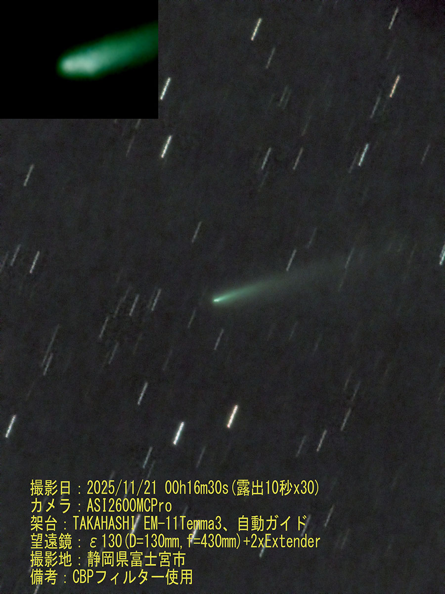 撮影対象:C/2025 K1 (ATLAS)彗星 撮影日時:2025/11/21 0h16m30s(露出10秒x30枚) 撮影者:横田(26期) カメラ :ZWO ASI2600MC(GAIN100、-10℃) 望遠鏡 :ε130(D=130mm、f=430mm)+2xExtender 架台 :Takahashi EM-11 Temma3+自動ガイド 場所 :静岡県富士宮市 備考 :CBPフィルター使用 分裂したA,B核は何とかわかりますが、中間のC核がわかりにくい