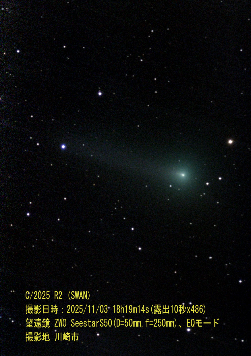 撮影対象:C/2025 R2 (SWAN)彗星 撮影日時:2025/11/3 18h19m14s(露出10秒x486枚) 撮影地:神奈川県川崎市 撮影者:横田(26期) 望遠鏡:ZWO SeestarS50(D=50mm、f=250mm)、EQモード自動ガイド