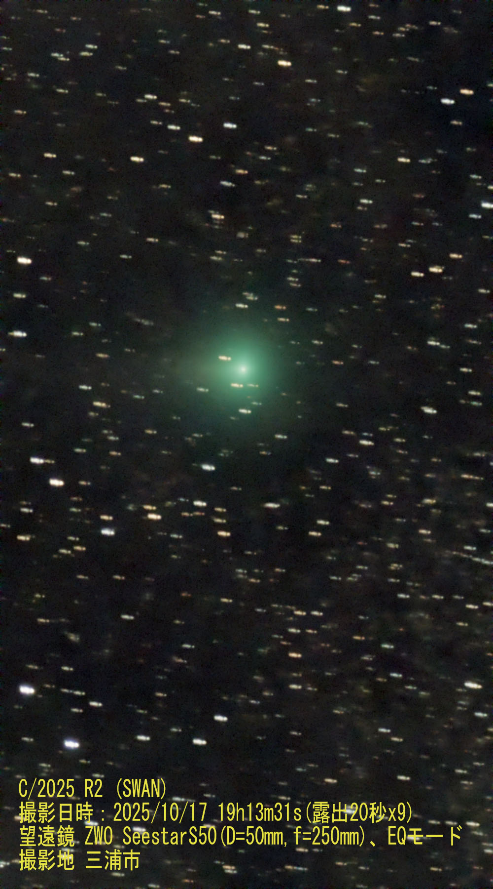 撮影対象:C/2025 R2 (SWAN)彗星 撮影日時:2025/10/17 19h13m31s(露出20秒x8枚) 撮影地:神奈川県三浦市 撮影者:横田(26期) 望遠鏡:ZWO SeestarS50(D=50mm、f=250mm)、EQモード自動ガイド
