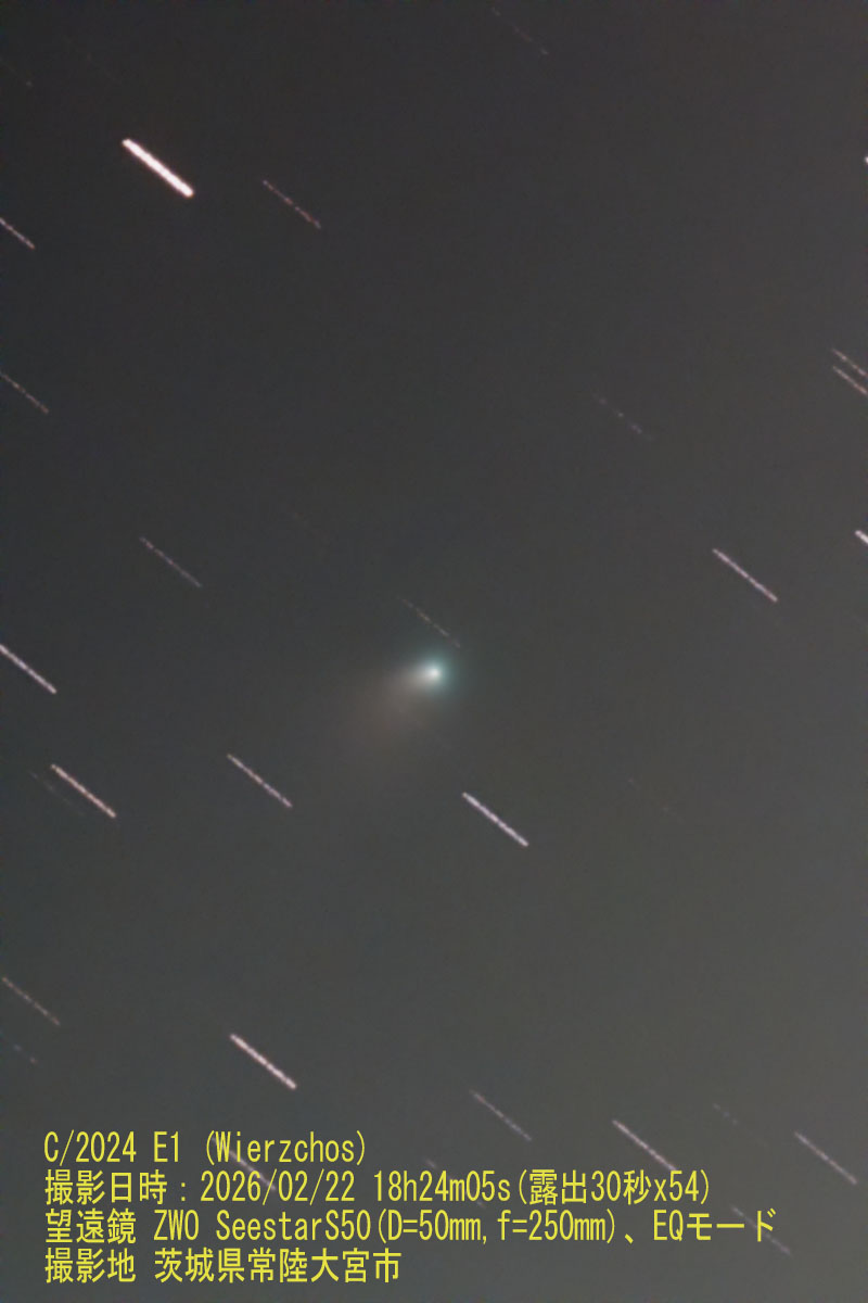 C/2024 E1 Wierzchos彗星 撮影 :横田 日時 :2026/2/22 18h24m05s(30秒)x54 望遠鏡 :ZWO SeestarS50(D=50mm、f=250mm)、EQモード自動ガイド 場所 :茨城県常陸大宮市