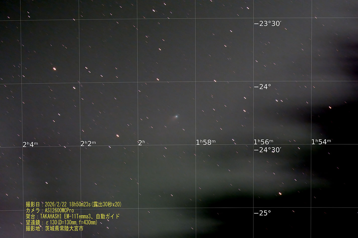 撮影対象:C/2024 E1 Wierzchos彗星 撮影 :横田 日時 :2026/2/22 18h50m23s(30秒x20) カメラ :ZWO ASI2600MC(GAIN100、-10℃) 望遠鏡 :ε130(D=130mm、f=430mm) 架台 :Takahashi EM-11 Temma3+自動ガイド 場所 :茨城県常陸大宮市