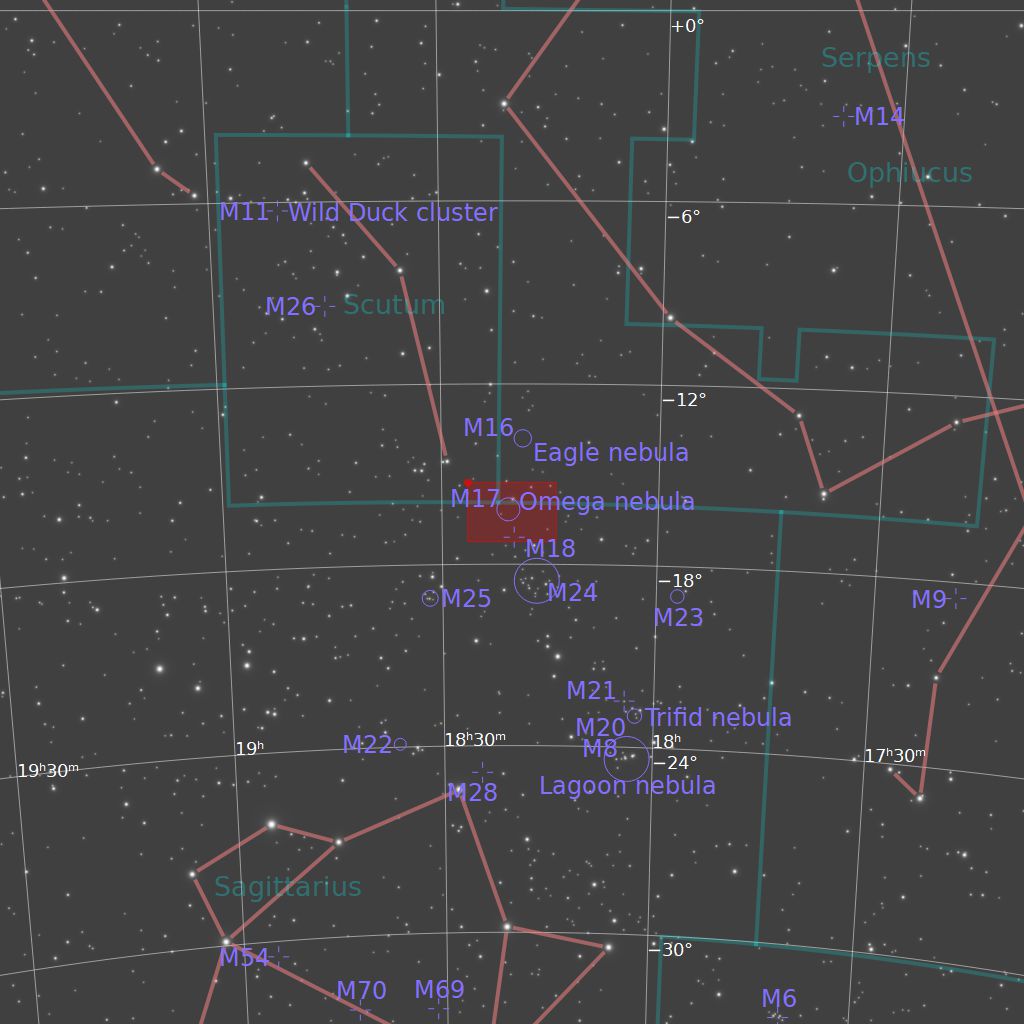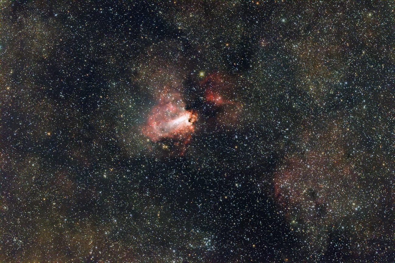 M17(オメガ星雲) 撮影 :横田 日時 :2022/05/05 02h20m(露出240秒x4枚) ISO :1600 カメラ :Canon EOS 60Da 望遠鏡 :タカハシε130(D=130mm、f=430mm) 架台 :タカハシEM-11 Temma3(PHD2自動ガイド) 場所 :福島県鮫川村 備考 :Kenkoスターリーナイトフィルター使用