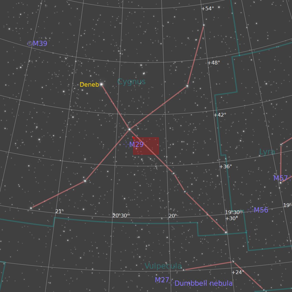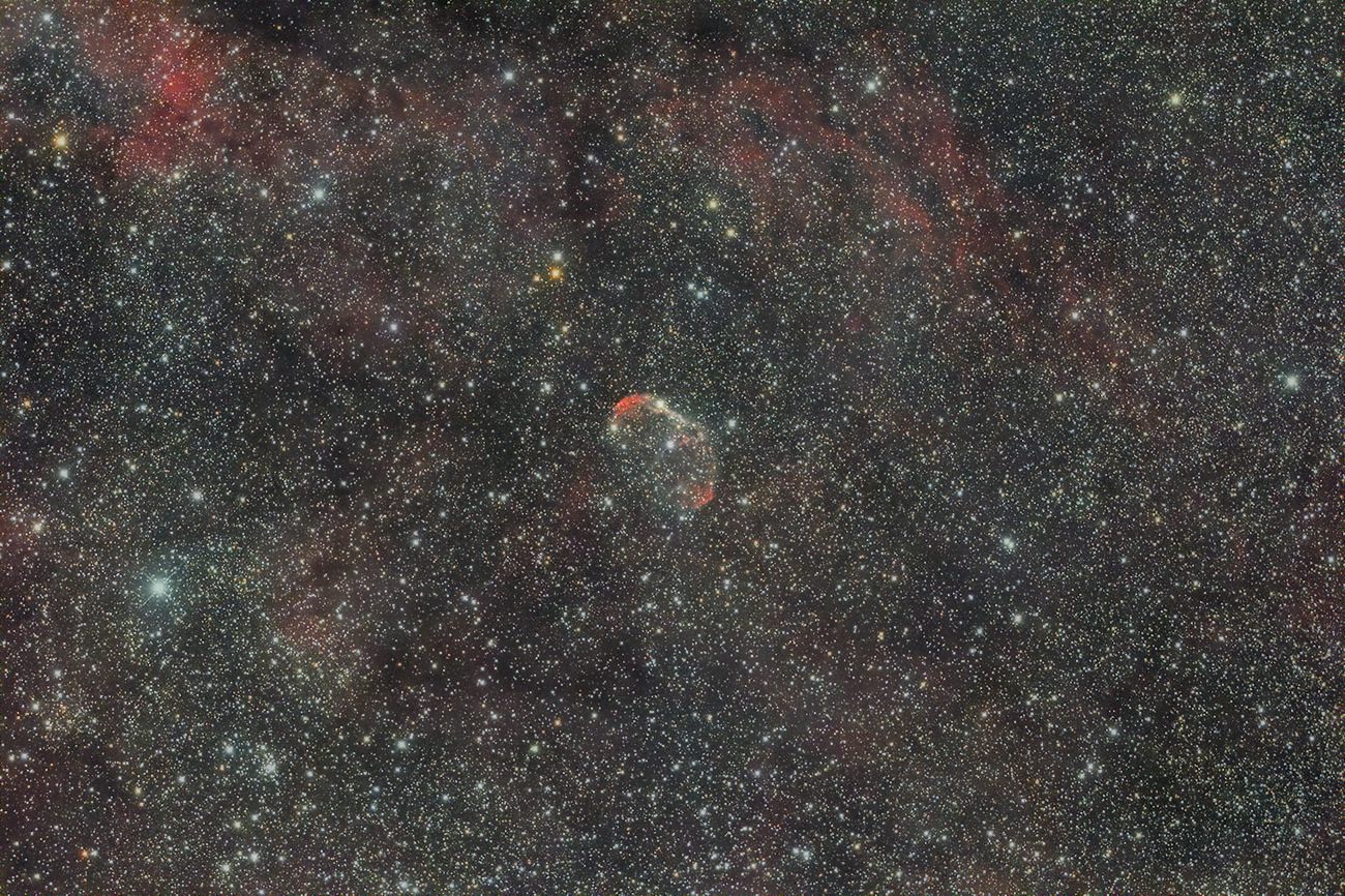 弧状星雲(NGC6888) 撮影 :横田 日時 :2022/05/05 02h43m(露出240秒x4枚) ISO :1600 カメラ :Canon EOS 60Da 望遠鏡 :タカハシε130(D=130mm、f=430mm) 架台 :タカハシEM-11 Temma3(PHD2自動ガイド) 場所 :福島県鮫川村 備考 :Kenkoスターリーナイトフィルター使用
