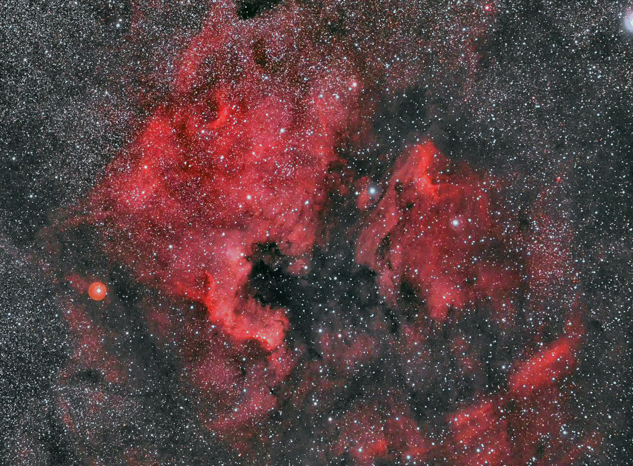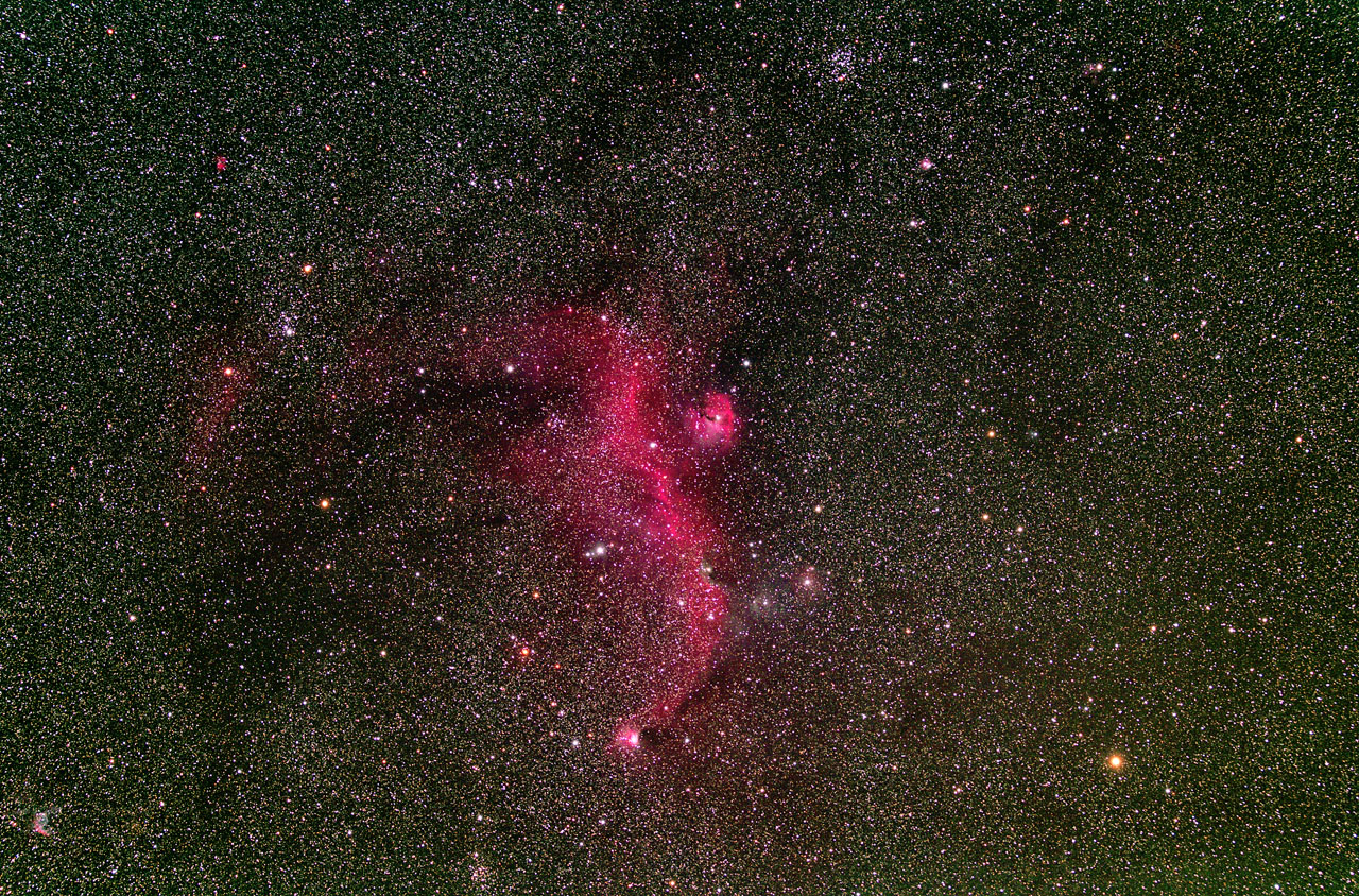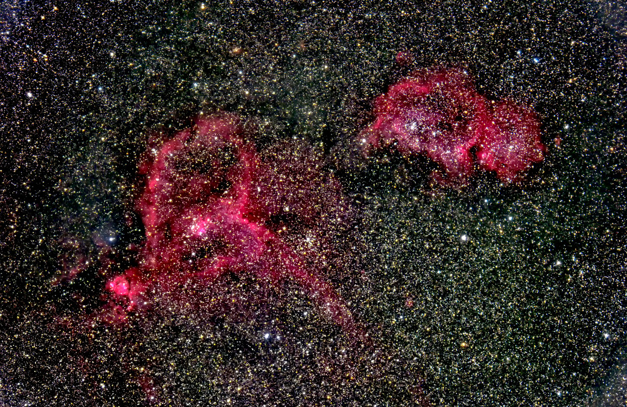 | IC1848&IC1805(ハート&胎児星雲) 日時:2021.11.7 露出5分x15枚 ISO:3200 カメラ:Nikon D810A レンズ:SIGMA60~600ズームを300㎜、F5.6で使用 架台:SXP2+PHD2自動ガイド 撮影:石黒 場所:長野県原村 |
