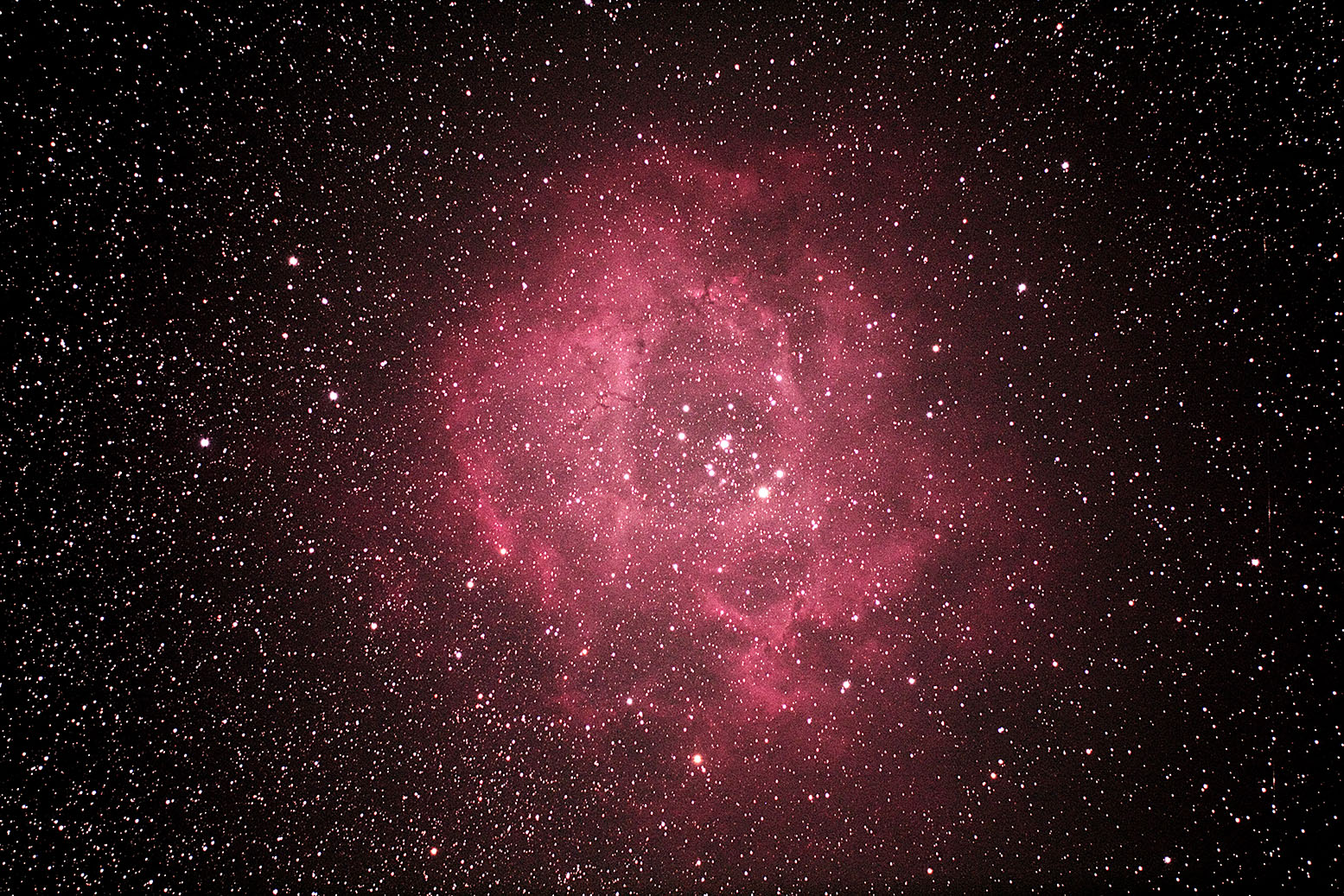 | バラ星雲(NGC2237-9, 2246) 日時:2013.02.10 19:28露出600秒 ISO400 カメラ:Canon EOS X4改 望遠鏡:FC76 (D76mm fl450mm F5.9) 架台:EM-11オートガイダー 撮影:小室 場所:茨城県常陸大宮市 |