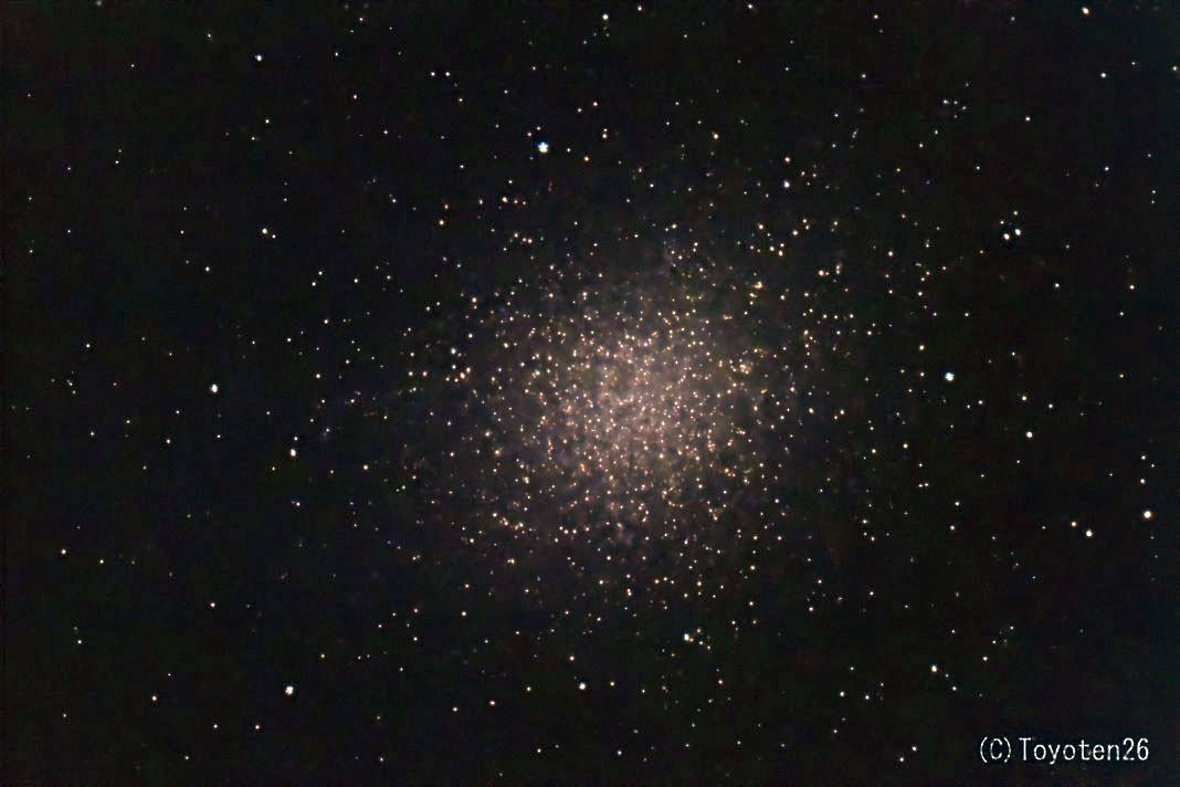 | オメガ星団(NGC5139) 日時:2011.04.29 22:18:27 露出:60秒 ISO:1600 RAW撮影 カメラ:Canon EOS X2 レンズ:SE200N 架台:EM-200Temma2自動ガイド 撮影:横田 場所:しらびそ高原 |