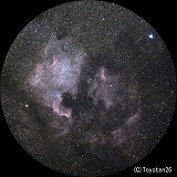 | M17(オメガ星雲) 撮影 :横田 日時 :2022/05/05 02h20m(露出240秒x4枚) ISO :1600 カメラ:Canon EOS 60Da 望遠鏡:タカハシε130(D=130mm、f=430mm) 架台 :タカハシEM-11 Temma3(PHD2自動ガイド) 場所 :福島県鮫川村 備考 :Kenkoスターリーナイトフィルター使用 |