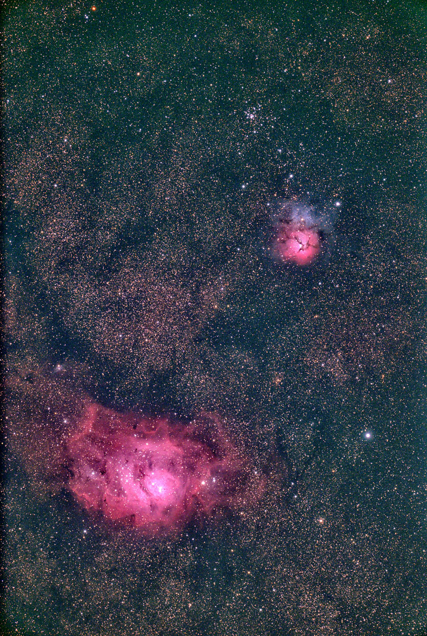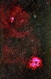 | M8(上)&M20(下) (三裂星雲&干潟星雲) 撮影年:2018年 カメラ:Nikon 810A 撮影:石黒 |