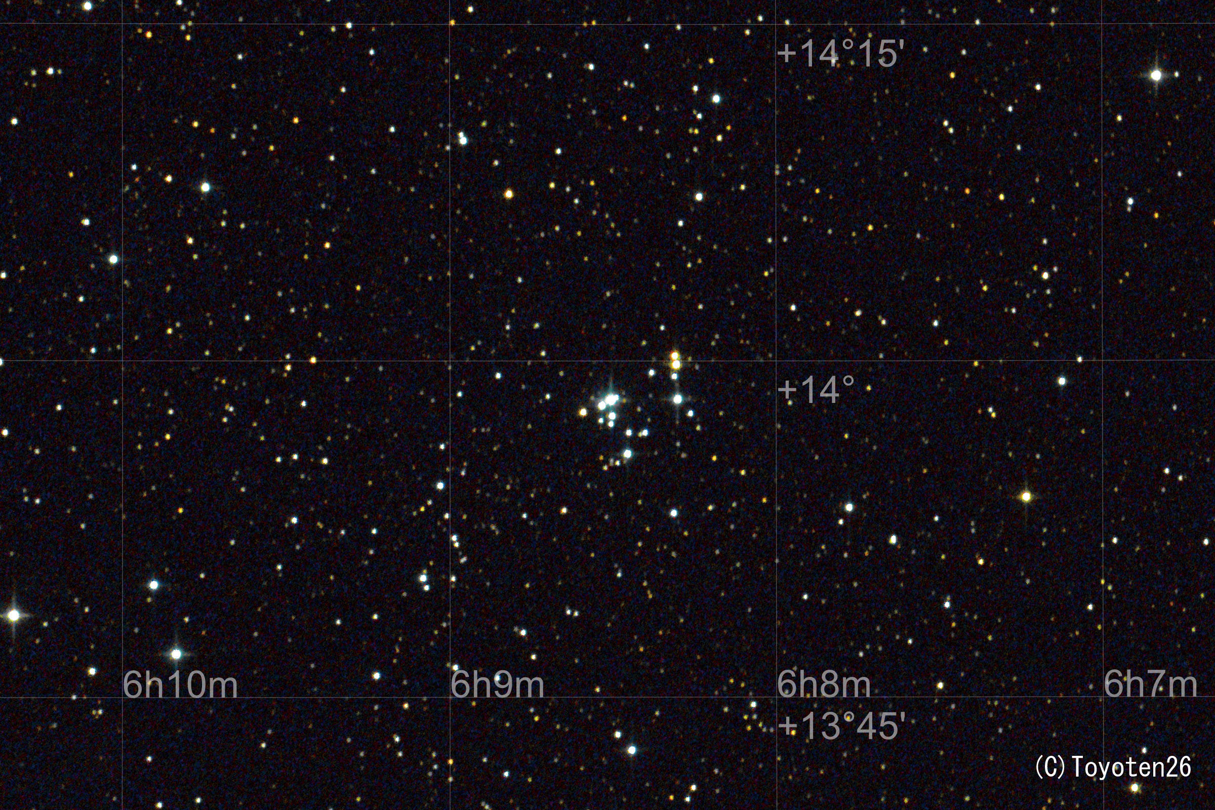 | クリスマスツリー星団と コーン星雲(NGC2264) 年月日:2016/12/03 露出5分x2 ISO:3200 カメラ:Nikon D810A 望遠鏡:VC200L直焦 架台:ビクセンSXP赤道儀 撮影:石黒 場所:長野県南牧村 |