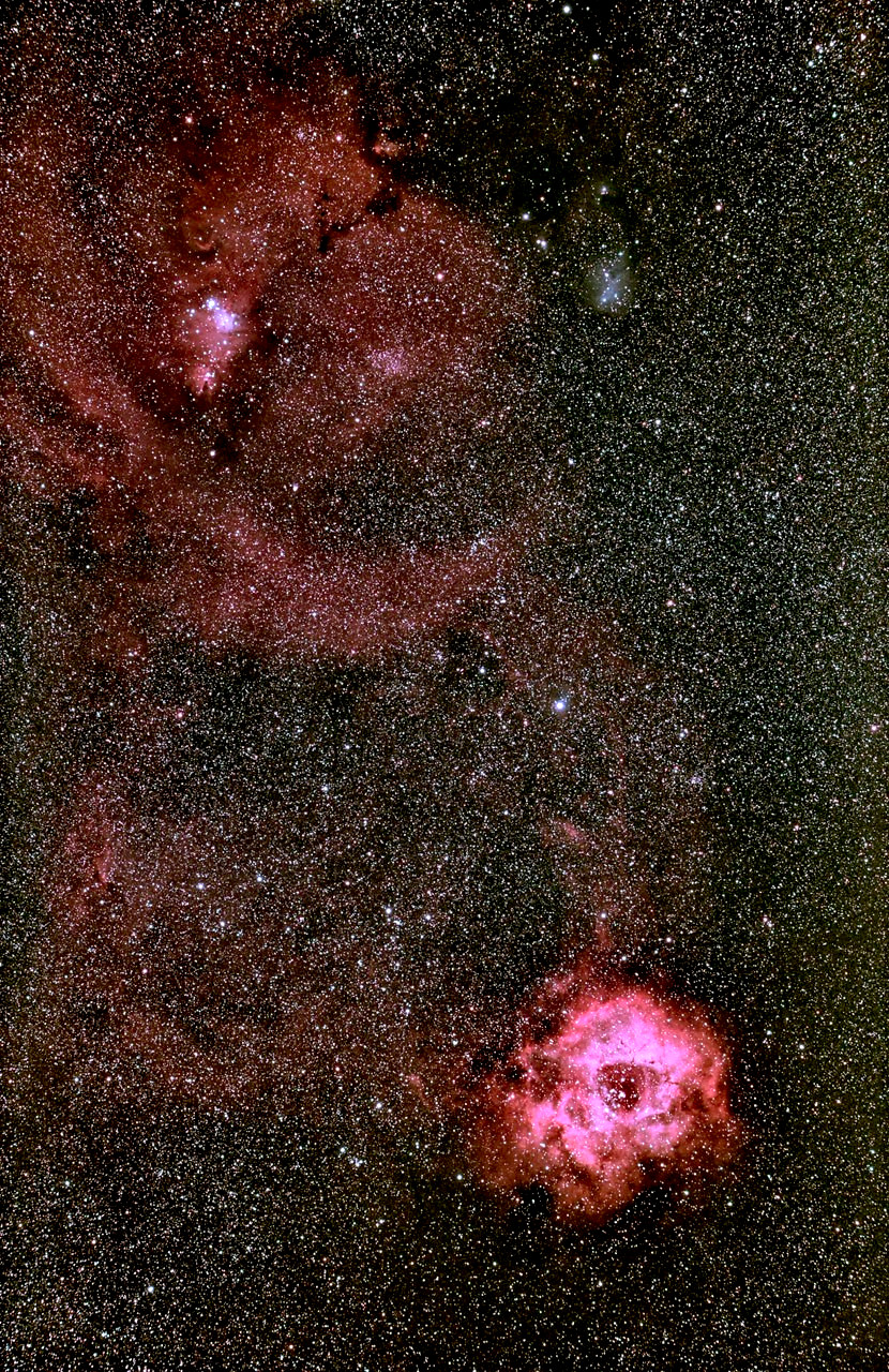 | ばら星雲(NGC2237-9)~ クリスマスツリー星団(NGC2264) 日時:2023.01.21 22h06m 露出:5分x5 ISO:800 RAW撮影 カメラ:Nikon D810A 望遠鏡:AskarFMA230(D=50mm、f=230mm) 架台:Vixen SXP2+PHD2自動ガイド 撮影:石黒 場所:花立 備考:QBPフィルター使用 |